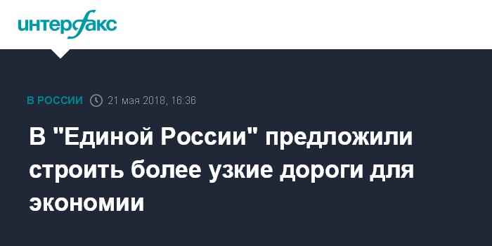 Москва. 21 мая. INTERFAX.RU - Для экономии бюджетных средств можно строить в России более узкие дороги, заявил на конференции партии "Единая Россия" Аркадий Фомин, член Генсовета партии.