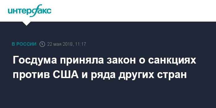 Москва. 22 мая. INTERFAX.RU - Госдума РФ во вторник приняла в третьем, окончательном чтении закон о санкциях против США и ряда других недружественных государств.