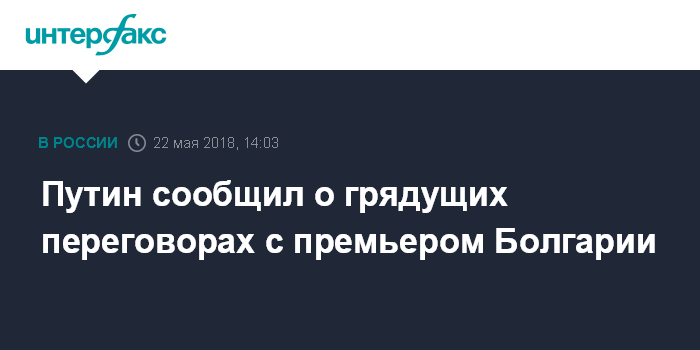 Москва. 22 мая. INTERFAX.RU - Президент РФ Владимир Путин сообщил, что через несколько дней Россию посетит премьер-министр Болгарии Бойко Борисов, с которым будут продолжены российско-болгарские переговоры.