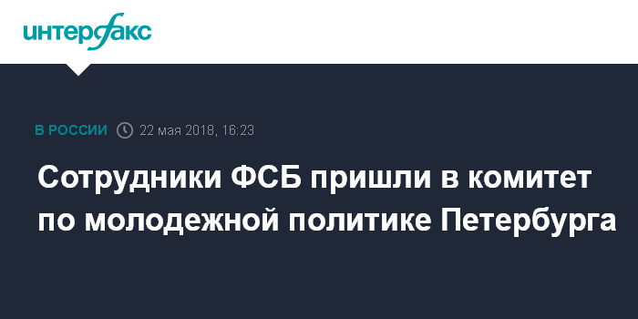 Москва. 22 мая. INTERFAX.RU - Сотрудники управления ФСБ по Петербургу и Ленинградской области во вторник проводят оперативные мероприятия в комитете по молодежной политике города, сообщили "Интерфаксу" в пресс-службе управления.