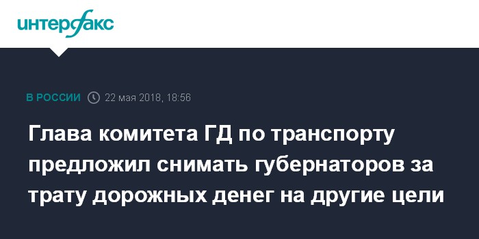 Москва. 22 мая. INTERFAX.RU - Председатель комитета Госдумы по транспорту и строительству Евгений Москвичев во вторник предложил снимать с должностей глав регионов РФ, которые тратят федеральные деньги, выдаваемые на дороги, на другие нужды.