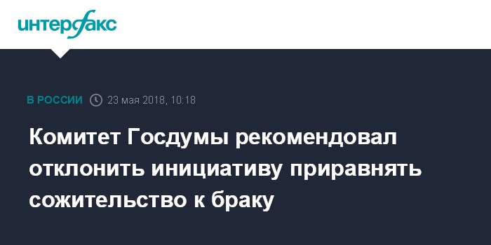 Москва. 23 мая. INTERFAX.RU - Комитет Госдумы по вопросам семьи, женщин и детей в среду рекомендовал отклонить законопроект, предлагающий приравнять к официальному браку незарегистрированный союз мужчины и женщины, проживающих совместно в течение пяти лет.