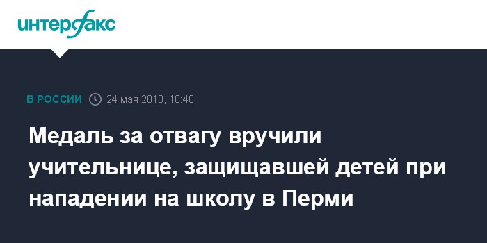 Москва. 24 мая. INTERFAX.RU - Губернатор Пермского края Максим Решетников на пленарном заседании регионального Законодательного собрания в четверг вручил медаль "За отвагу" учительнице пермской школы №127 Наталье Шагулиной, которая пострадала при нападении двух подростков на учебное заведение, передал корреспондент "Интерфакс" с места события.