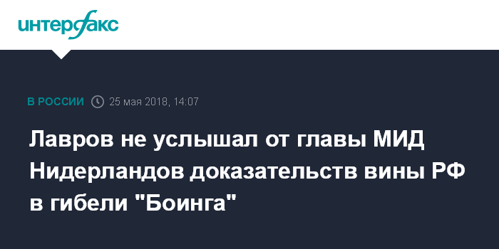 Москва. 25 мая. INTERFAX.RU - Глава МИД РФ Сергей Лавров сообщил, что в телефонном разговоре со своим нидерландским коллегой Стефом Блоком обсудил ситуацию с обвинением России в причастности к крушению малайзийского "Боинга" на Украине в 2014 году, но не услышал от голландского коллеги никаких фактов, доказывающих это.