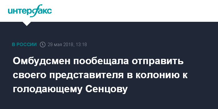 Москва. 29 мая. INTERFAX.RU - Уполномоченный по правам человека в РФ Татьяна Москалькова обратится в Федеральную службу исполнения наказаний (ФСИН), чтобы получить для сотрудника своего аппарата разрешение на посещение осужденного в России украинского режиссера Олега Сенцова, проводящего с 14 мая голодовку в колонии.