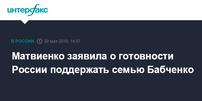 Москва. 30 мая. INTERFAX.RU - Россия готова оказать поддержку семье убитого в Киеве журналиста Аркадия Бабченко, заявила спикер Совета Федерации Валентина Матвиенко.