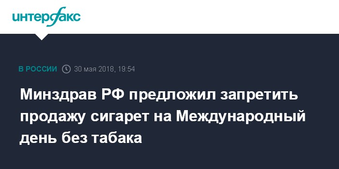 "Минздрав России подготовил и направил в регионы письмо с предложением ограничить продажу табачных изделий 31 мая, когда во всем мире будет отмечаться Всемирный день без табака", - говорится в сообщении.