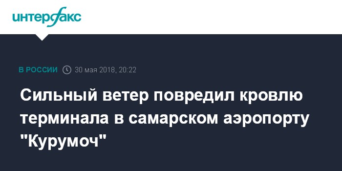 Москва. 30 мая. INTERFAX.RU - Специалисты устраняют последствия сильного ветра, повредившего кровлю пассажирского терминала в зоне внутренних рейсов международного аэропорта "Курумоч" (Самара).