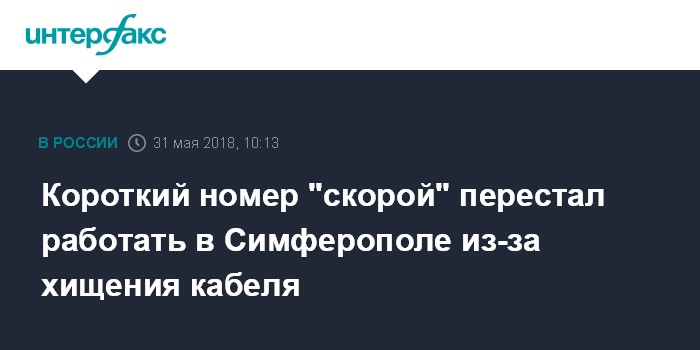 Москва. 31 мая. INTERFAX.RU - Хищение телефонного кабеля привело к невозможности с раннего утра четверга принимать вызовы "скорой помощи" по номеру "103" в столице Крыма, сообщает министерство здравоохранения республики.