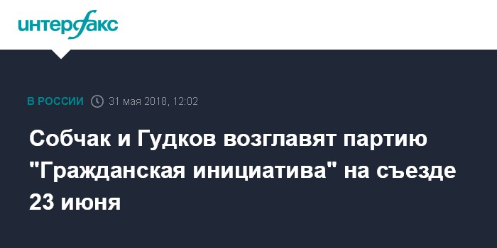 Москва. 31 мая. INTERFAX.RU - Съезд партии "Гражданская инициатива", где ее переименуют в "Партию перемен" и выберут ее лидерами Дмитрия Гудкова и Ксению Собчак, состоится 23 июня.