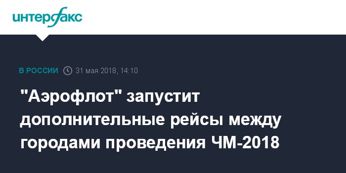 Москва. 31 мая. INTERFAX.RU - "Аэрофлот" открыл продажу билетов на дополнительные авиарейсы по России на время Чемпионата мира по футболу, говорится в сообщении авиакомпании.