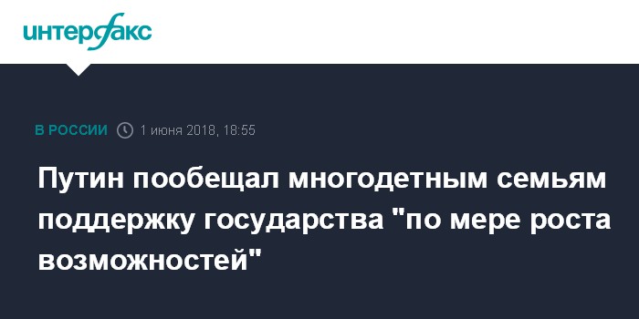 Москва. 1 июня. INTERFAX.RU - Президент РФ Владимир Путин пообещал, что государство будет предпринимать дополнительные усилия для поддержки многодетных семей.