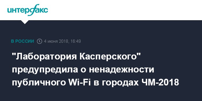 Москва. 4 июня. INTERFAX.RU - Более 20% точек публичного доступа к Wi-Fi в российских городах, где пройдут матчи чемпионата мира по футболу, небезопасны, их использование может привести к утечке персональных данных пользователей, сообщили в пресс-службе "Лаборатории Касперского".