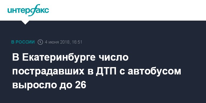 Москва. 4 июня. INTERFAX.RU - По уточненным данным, в ДТП с автобусом и легковым автомобилем в Екатеринбурге пострадали 26 человек, из них 24 госпитализированы, сообщили агентству "Интерфакс" в пресс-службе горздрава Екатеринбурга.