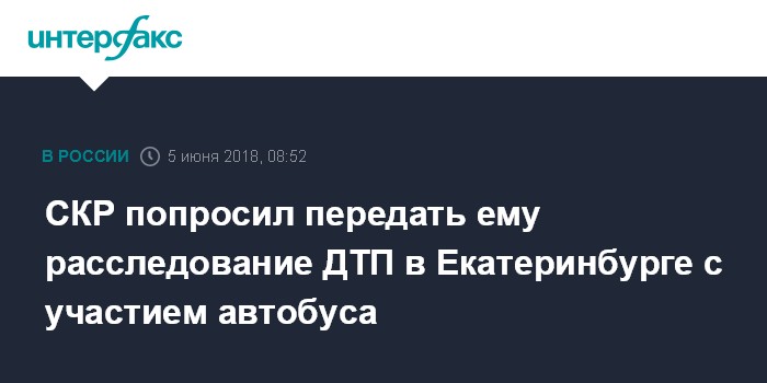 Москва. 5 июня. INTERFAX.RU - Свердловское СУ СК России инициировало изъятие и передачу им уголовного дела, возбужденного в связи с автоаварией в Екатеринбурге с участием маршрутного автобуса.