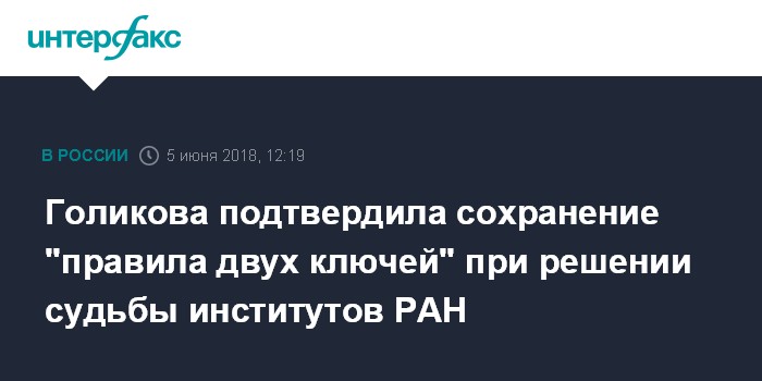 "Еще раз повторяю: "правило двух ключей" сохраняется", - сказала Голикова на заседании президиума Российской академии наук, отвечая на вопросы академиков.