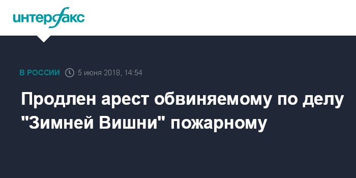 Москва. 5 июня. INTERFAX.RU - Центральный районный суд в Кемерове продлил срок содержания под стражей пожарного Сергея Генина, который участвовал в ликвидации пожара в ТРЦ "Зимняя вишня".
