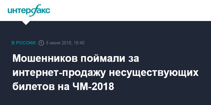 Москва. 5 июня. INTERFAX.RU - Полицейские задержали трех мошенников, продававших несуществующие билеты на Чемпионат мира по футболу FIFA, сообщила "Интерфаксу" официальный представитель МВД РФ Ирина Волк.