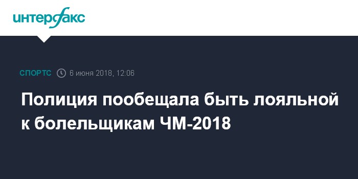 Москва. 6 июня. INTERFAX.RU - Полиция готова "закрыть глаза" на мелкие правонарушения болельщиков, которые приедут в Россию для участия в ЧМ-2018, но будут жестко реагировать в случае серьезных правонарушений, сообщил первый замначальника Управления по обеспечению безопасности крупных международных и массовых спортивных мероприятий МВД России Антон Гусев.