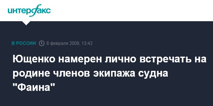 Москва. 6 февраля. INTERFAX.RU - Президент Украины Виктор Ющенко намерен через несколько дней лично встретить на родине украинцев из освобожденного из пиратского плена судна "Фаина", сообщила пресс-секретарь главы государства Ирина Ванникова.
