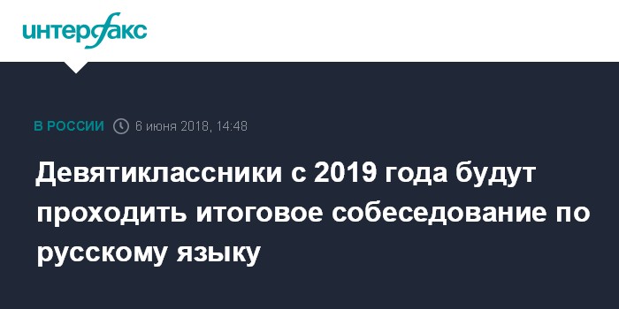 Москва. 6 июня. INTERFAX.RU - Итоговое собеседование по русскому языку станет обязательным для учеников 9-х классов школ со следующего учебного года, апробация испытания прошла этой весной и признана успешной, заявили в Рособрнадзоре.