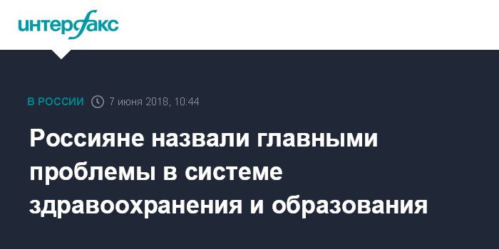 Москва. 7 июня. INTERFAX.RU - Тройку самых актуальных проблем, по мнению россиян, составляют состояние системы здравоохранения, сфера образования и экономическое положение России, свидетельствуют результаты опроса ВЦИОМ.