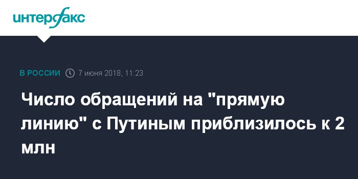 Москва. 7 июня. INTERFAX.RU - Количество обращений граждан к президенту РФ Владимира Путина за час до начала "прямой линии" приближается к двум миллионам.