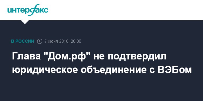 Москва. 7 июня. INTERFAX.RU - Юридическое объединение АО "Дом.рф" и ВЭБ не планируется, сообщил журналистам в четверг генеральный директор Дом.рф Александр Плутник.