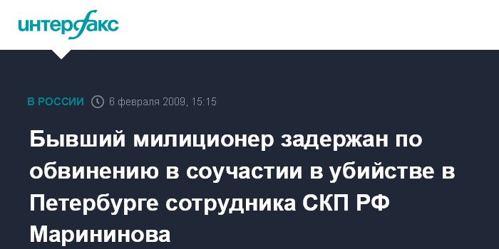 Москва. 6 февраля. INTERFAX.RU - В Санкт-Петербурге раскрыто громкое преступление - убийство сотрудника Следственного комитета при прокуратуре (СКП) РФ Дмитрия Марининова.