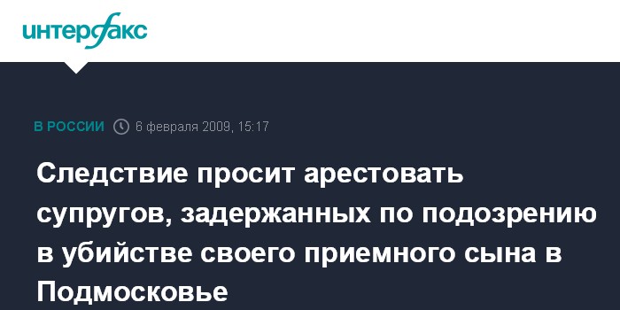 "Сегодня следственными органами СКП РФ по Московской области в Люберецкий городской суд направлено ходатайство об избрании в отношении семейной пары, подозреваемой в убийстве своего приемного сына, меры пресечения в виде заключения под стражу", - сообщил "Интерфаксу" официальный представитель СКП РФ Владимир Маркин в пятницу.