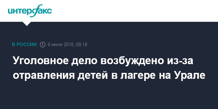 Москва. 9 июня. INTERFAX.RU - Следственные органы возбудили уголовное дело после госпитализации 64 детей с признаками кишечной инфекции из летнего лагеря в Свердловской области.
