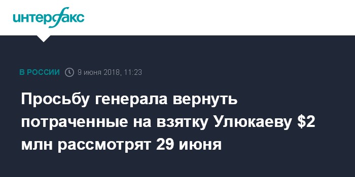 Просьбу генерала вернуть потраченные на взятку Улюкаеву $2 млн рассмотрят 29 июня