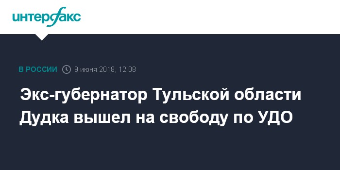 Москва. 9 июня. INTERFAX.RU - Бывший губернатор Тульской области Вячеслав Дудка, приговоренный к девяти с половиной годам колонии строгого режима за взяточничество, вышел на свободу условно-досрочно, сообщил в субботу "Интерфаксу" информированный источник.
