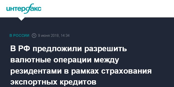 Москва. 9 июня. INTERFAX.RU - Правительство РФ предлагает разрешить валютные операции между резидентами в случае, если они связанны с заключением договоров страхования экспортных кредитов и инвестиций от предпринимательских или политических рисков.