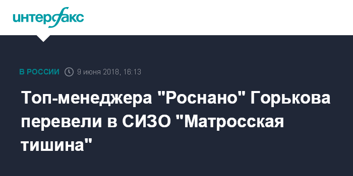 Москва. 9 июня. INTERFAX.RU - Обвиняемый в хищении у "Роснано" управляющий директор корпорации по инвестиционной деятельности Андрей Горьков переведен в следственный изолятор "Матросская тишина", где будет содержаться во время ареста.