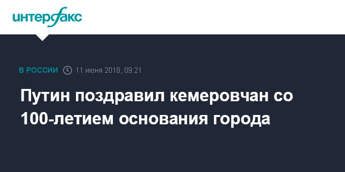 Москва. 11 июня. INTERFAX.RU - Президент РФ Владимир Путин поздравил жителей города Кемерово со 100-летием основания города.