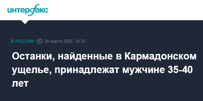 Владикавказ. 26 марта. INTERFAX.RU - По предварительным данным, полученным в ходе первоначального экспертного исследования, человеческие останки, найденные у Кармадонских ворот на месте схода ледника Колка, могут принадлежать мужчине в возрасте до 40 лет.