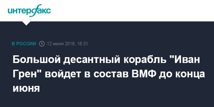 Москва. 12 июня. INTERFAX.RU - Большой десантный корабль (БДК) "Иван Грен" войдет в состав Военно-морского флота (ВМФ) России до конца июня текущего года, сообщает во вторник Минобороны.