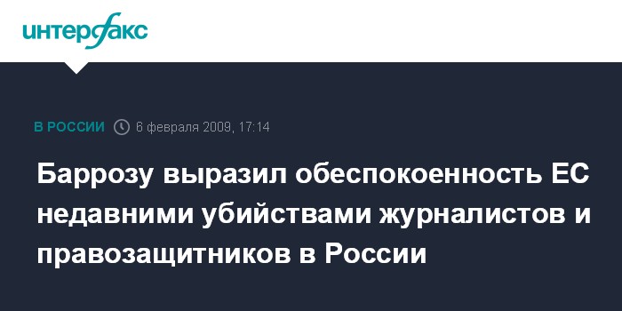 Москва. 6 февраля. INTERFAX.RU - Глава Еврокомиссии Жозе Мануэл Баррозу заявил, что в Европе обеспокоены недавними случаями убийств журналистов и правозащитников в РФ.