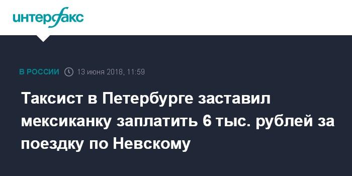 Москва. 13 июня. INTERFAX.RU - Сотрудники правоохранительных органов разыскивают таксиста, заставившего мексиканку заплатить 6 тысяч рублей за двухкилометровую поездку по Невскому проспекту, сообщил "Интерфаксу" информированный источник в среду.