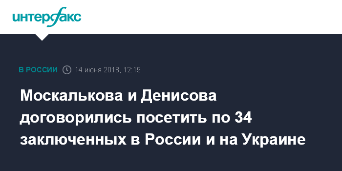 Москва. 14 июня. INTERFAX.RU - Уполномоченные по правам человека России и Украины рассчитывают посетить по 34 заключенных на территориях обеих стран, сообщила российский омбудсмен Татьяна Москалькова.