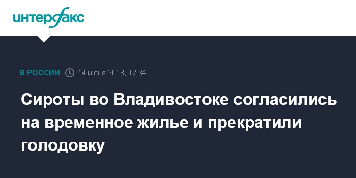 Москва. 14 июня. INTERFAX.RU - Сироты, разбившие в минувшую среду палаточный лагерь на центральной площади Владивостока и объявившие голодовку, требуя положенные им по закону квартиры, прекратили акцию, согласившись на временное жилье, предоставленное местными властями.
