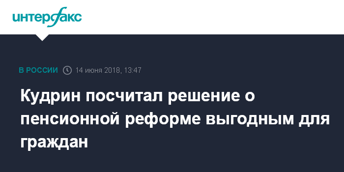 "Пенсионная реформа назрела давно. Наконец, решение принято. Это выгодное для граждан решение, оно позволит повысить пенсии", - написал Кудрин в своем твиттере после обнародования на заседании правительства предложений по пенсионной реформе.
