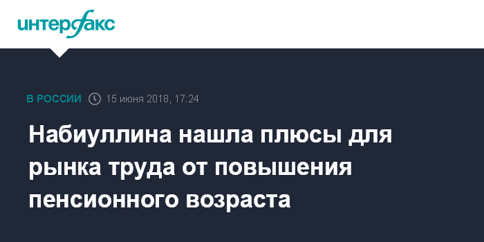Москва. 15 июня. INTERFAX.RU - Повышение пенсионного возраста в целом окажет положительное влияние на рынок труда, считает председатель ЦБ РФ Эльвира Набиуллина.