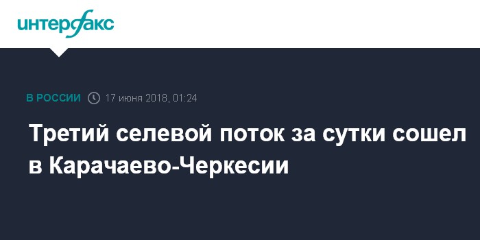 Москва. 17 июня. INTERFAX.RU - Три селевых потока сошли за сутки из-за сильных дождей на автодороги в горных и предгорных районах Карачаево-Черкесии, погибших и пострадавших нет.
