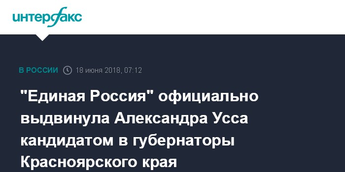 Москва. 18 июня. INTERFAX.RU - Делегаты красноярской региональной конференции "Единой России" выдвинули Александра Усса кандидатом на выборах губернатора Красноярского края, сообщается на официальном портале регионального отделения партии.