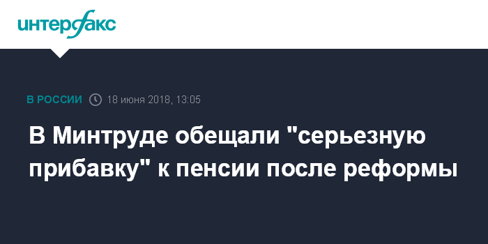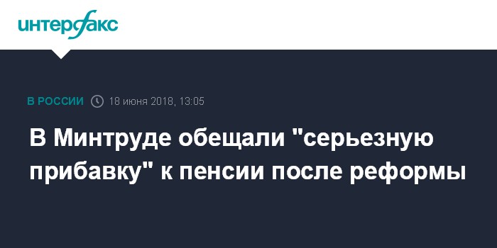 Голикова назвала сумму средней прибавки к пенсии после повышения пенсионного возрастаЧитать подробнее"То есть это серьезная прибавка, такого роста у нас реальных пенсий вообще не было никогда, тем более в последние годы", - добавил министр. Он отметил, что "весь выигрыш здесь, естественно, получат те люди, которые находятся на пенсии". "В противном случае мы просто не сможем ни сбалансировать систему, ни выйти на это улучшение показателей для пенсионеров", - сказал Топилин.