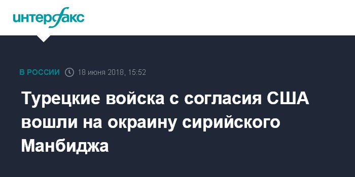 Москва. 18 июня. INTERFAX.RU - Турецкие военные вошли в районы на окраине города Манбидж, расположенного на севере Сирии, сообщает в понедельник газета Daily Sabah.