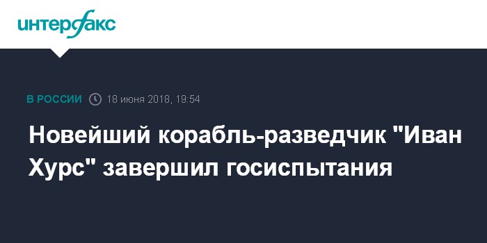 Москва. 18 июня. INTERFAX.RU - Государственные испытания разведывательного корабля "Иван Хурс" завершены, скоро судно войдет в состав Военно-морского флота (ВМФ) России, сообщает пресс-служба "Северной верфи" (Санкт-Петербург)