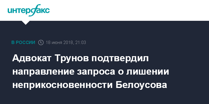 Адвокат Трунов подтвердил направление запроса о лишении неприкосновенности Белоусова